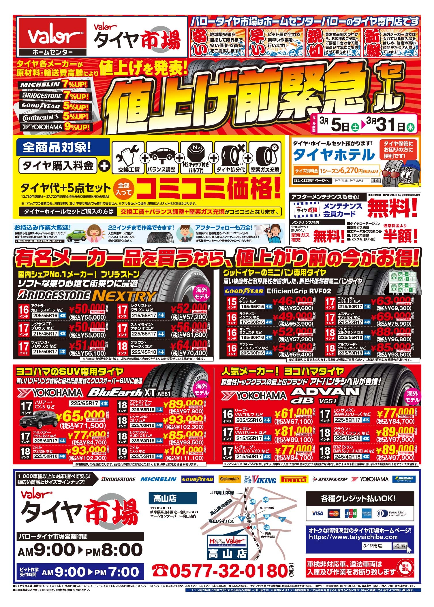 値上がり前の最終チラシ!!バロータイヤ市場高山店タイヤ・スタッドレス・オールシーズンが安いタイヤ専門店。