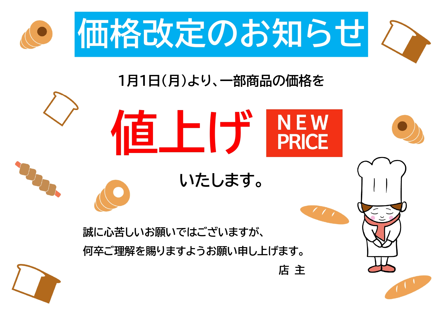 パン屋さん用商品の「価格改定」のご案内 張り紙 テンプレート・材料費高騰による値上げに使 イラストボックス「プレミアム」テンプレート。