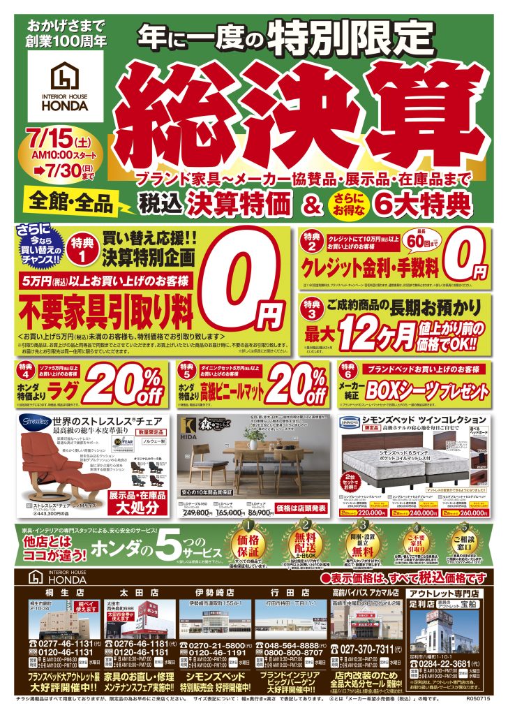 桐生店 年に一度の特別限定総決算!全品全館税込決算特価&お得な6大特典!家具のホンダ。