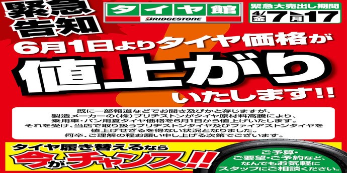 タイヤ値上げのお知らせ店舗おススメ情報タイヤ館 日永 三重県。