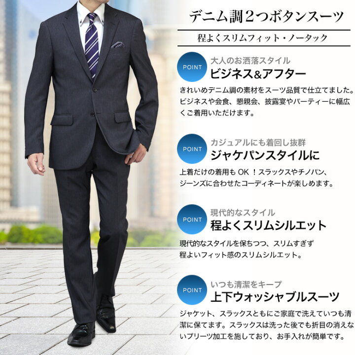 楽天市場 デニム調スーツ メンズ スリム 上下洗える ウォッシャブル 春物 ストレッチ 2つボタン スリムフィット ノータック ビジネススーツカジュアル オシャレ デニムスーツ 春夏秋冬 オールシーズン 卒業式 卒園式 パパ セレモニー 入社式 : メンズスーツKOKUBO。