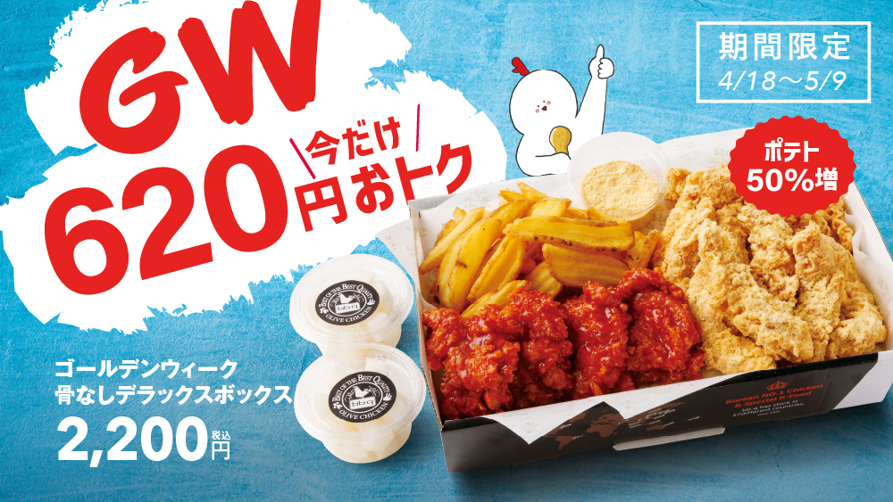 ◇◇こちらの商品は販売終了いたしました◇◇ 期間限定 ゴールデンウィーク GW 中だけ620円オトク!骨なしデラックスボックスがお値段そのままにポテト50%増量中bb.qオリーブチキンカフェ。