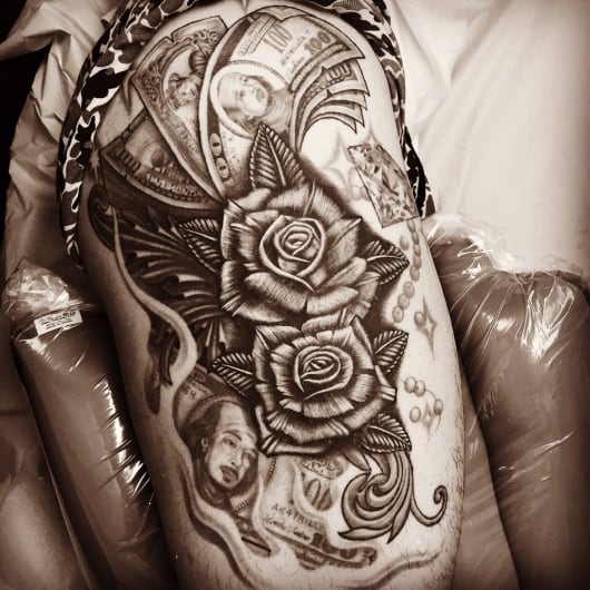バラ・マネーローズのタトゥーデザイン 胸・ドル札・チカーノ東京 タトゥースタジオ 吉祥寺 Red Bunny Tattoo タトゥーデザイン・ タトゥー画像。