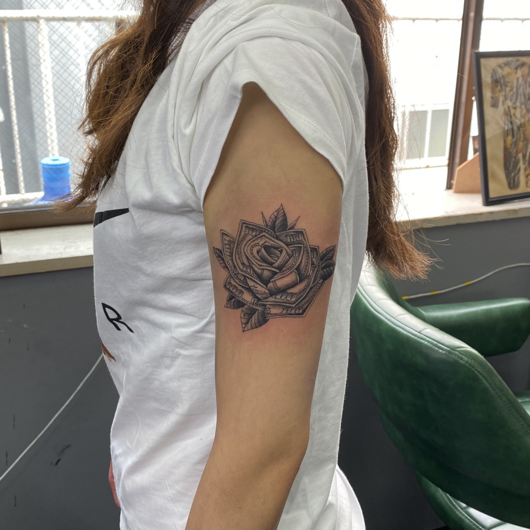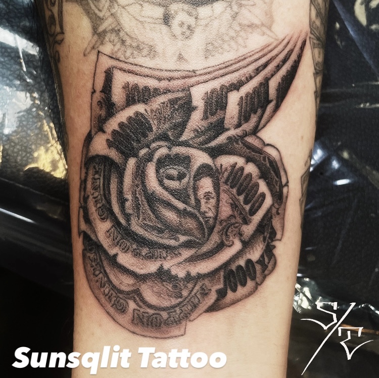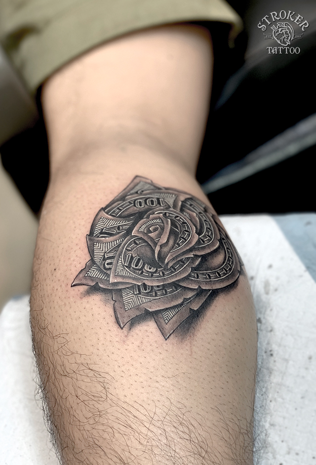 ブラック&グレー ドル札・ローズ 薔薇東京の渋谷・秋葉原・原宿でタトゥースタジオはSunsqlit Tattoo。