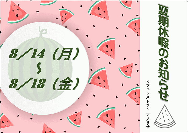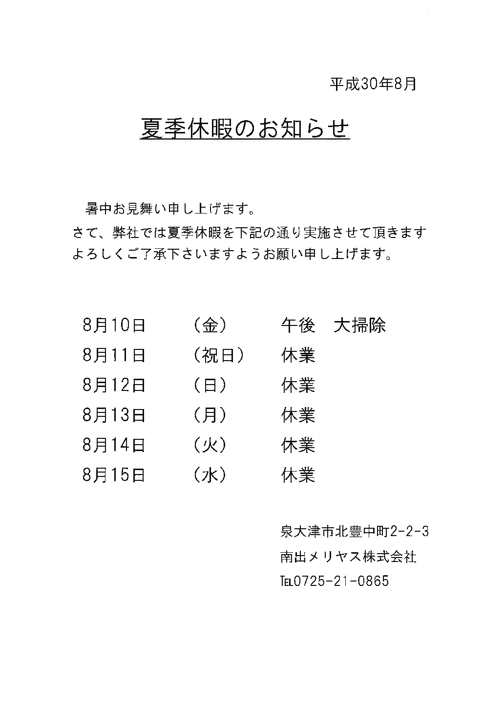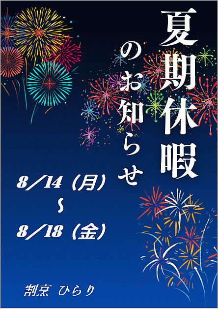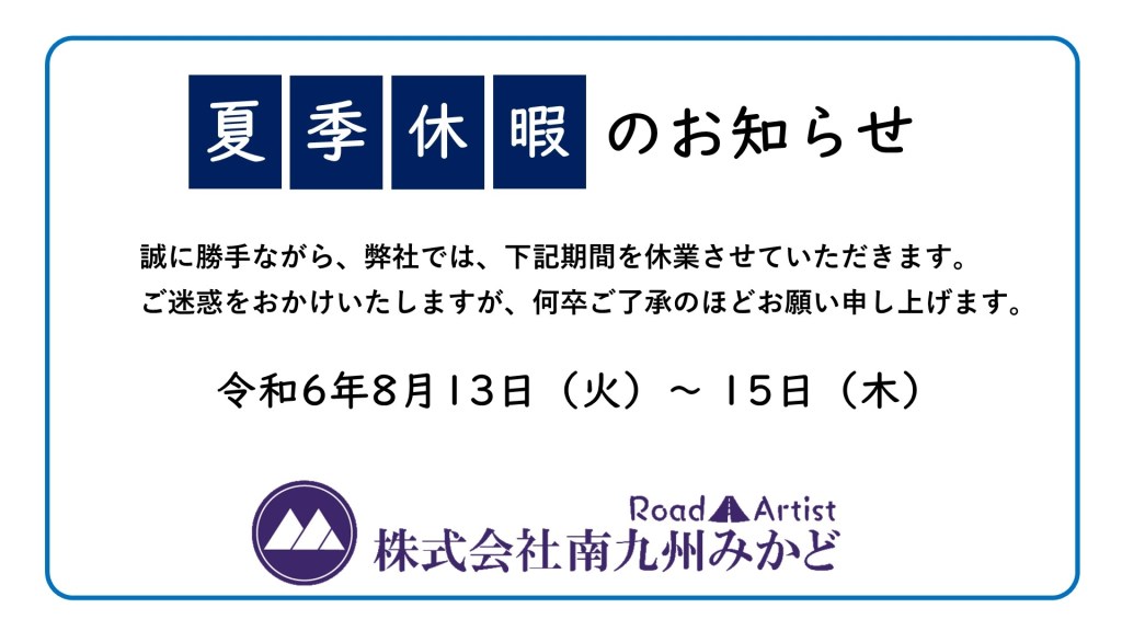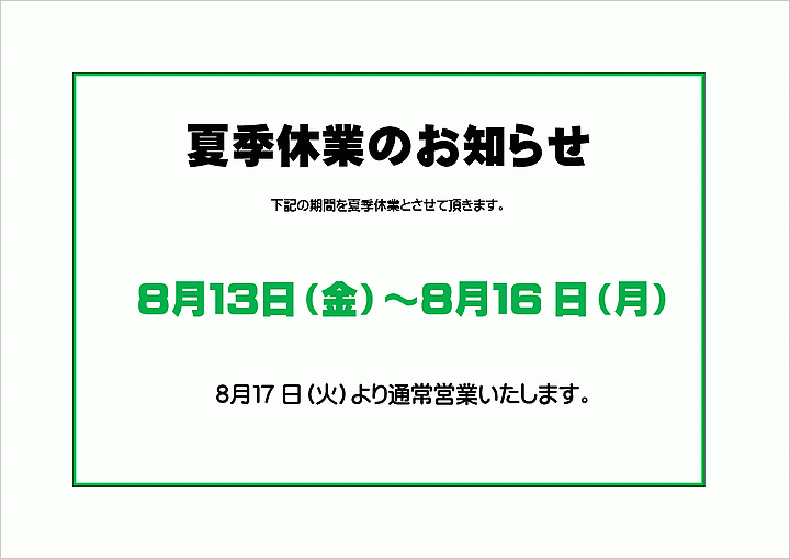 お知らせ 夏季休暇期間中の休業及び出荷について。