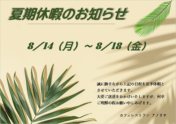 夏期休暇のお知らせイラスト入り張り紙のテンプレート・登録不要で無料ダウンロード - 登録不要のフリーテンプレート。