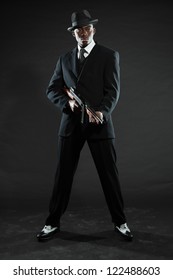 銃を持つスーツを着た黒いアメリカのマフィアギャングスター。写真素材122488603Shutterstock。