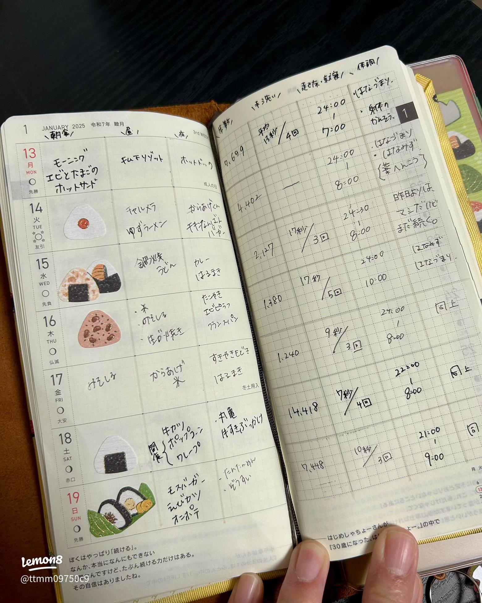 weeksの使い方紹介✏️毎日の食事記録をつけてみる体重管理やおいしいものの記録にも。 スペースを3分割できる、ツードット時間軸を活用することで、 さらに使い方が広がります。 @hobonichitecho_officialほぼ日手帳ほぼ日手帳weeks食事記録週間手帳。