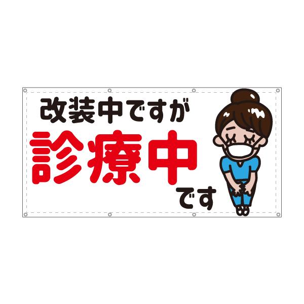 改装中ですが診療中 ナース ドクター 看護師 エステ 病院 女の子 女性 可愛い 目立つ お知らせ 幕 懸垂幕 垂れ幕 ターポリン幕 足場シート900×1800 防炎 幕デザイン 足場幕・現場シート・建築シート横断幕・懸垂幕キング株式会社イタミアート。