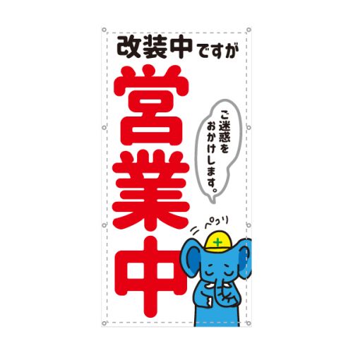 防炎 改装中ですが営業中 ゾウ ぞう 縦 動物 アニマル 可愛い 目立つ お知らせ 幕 懸垂幕 垂れ幕 タペストリー ターポリン幕 足場シート450×900 スモールサイズ 足場幕・現場シート・建築シートのデータ入稿横断幕・懸垂幕キング株式会社イタミアート。