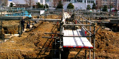 マンション新築用足場工事平尾化建株式会社 – くさび式足場の足場組立。