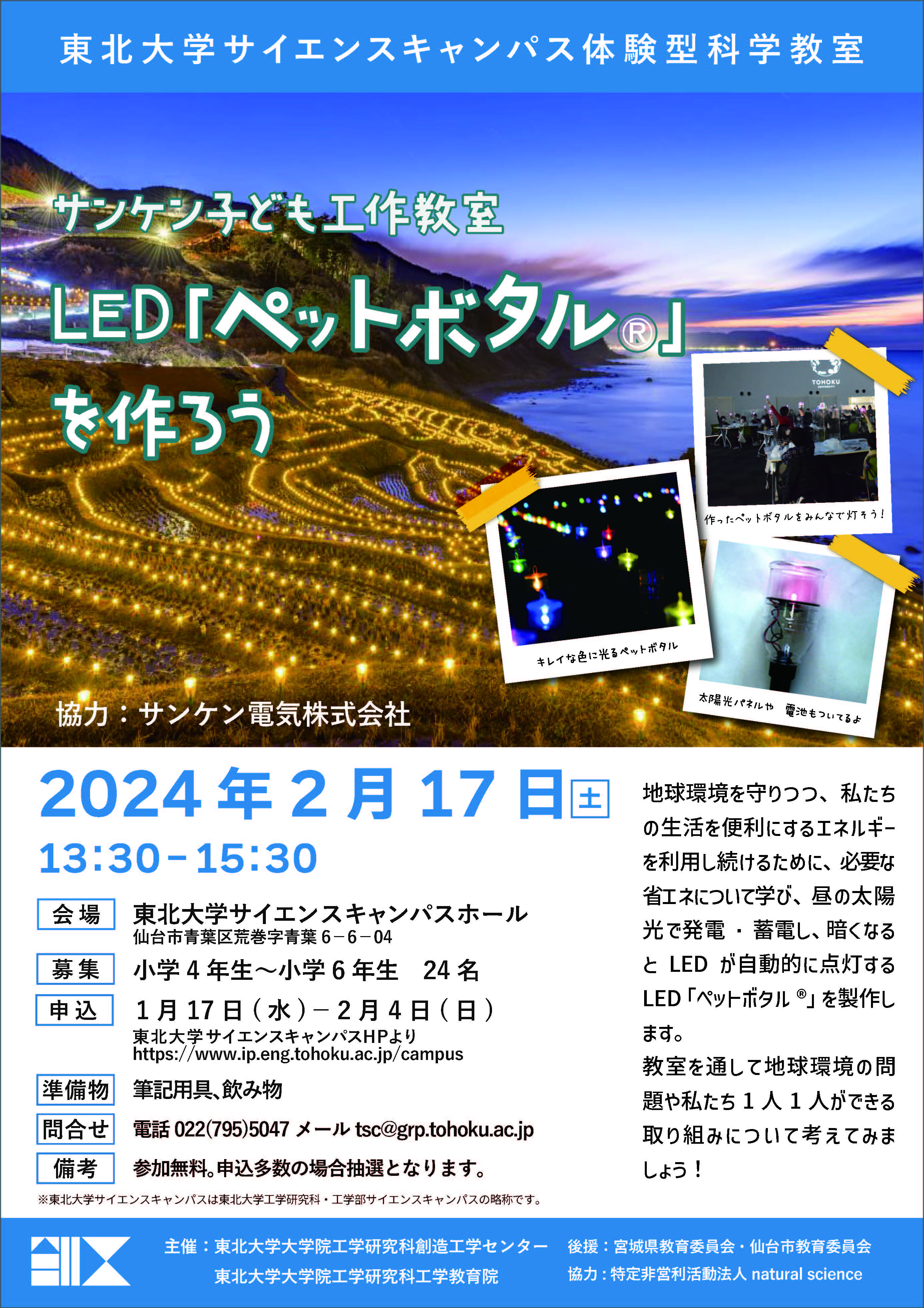 サンケン子ども工作教室『LED「ペットボタル」を作ろう』学都「仙台・宮城」サイエンスコミュニティ。