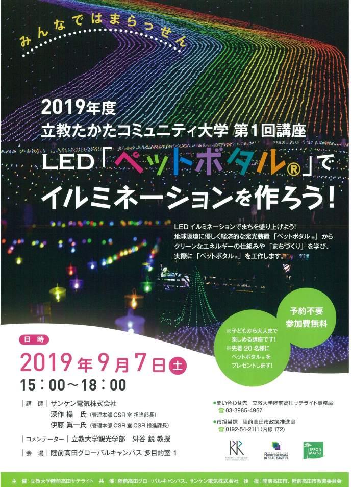 立教大学の岩手県陸前高田市民向け講座を9 7開講「LED『ペットボタル®』でイルミネーションを作ろう!」 2019年度 立教たかたコミュニティ大学第1回講座立教大学。