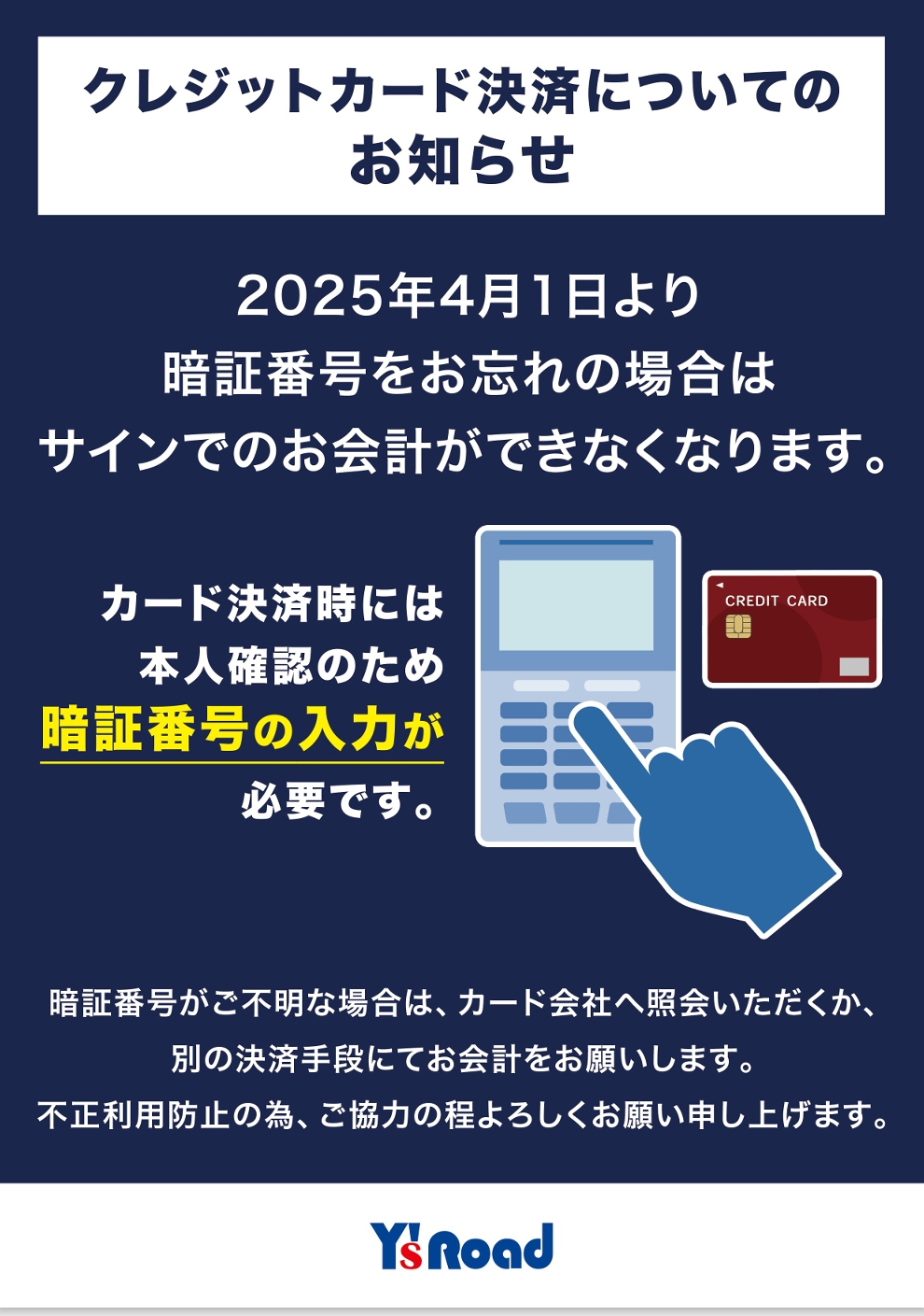 クレジットカード決済についてのお知らせ 来月4月1日より暗証番号をお忘れの場合、サインでのお会計ができなくなりますスポーツ自転車のことならY'sRoad 府中多摩川店。