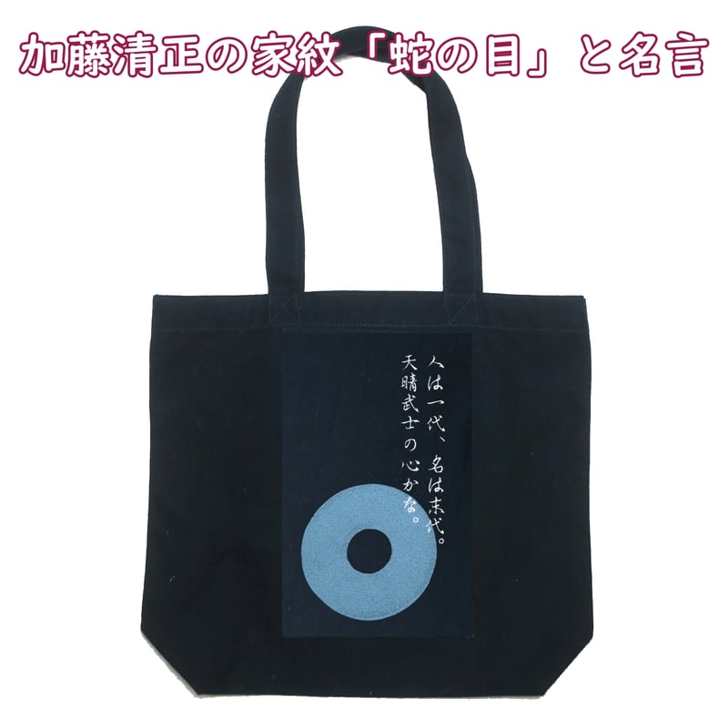 戦国武将 加藤清正の家紋「蛇の目」と名言 刺繍 キャンバストートバッグWW30×H35。