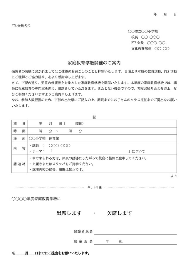 学校関連08「PTA家庭教育学級開催のご案内」 ワード・Word 無料ダウンロードテンプレートNAVI。