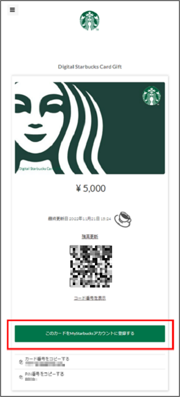 受け取ったデジタル スターバックス カード ギフトをスターバックス 公式ホームページ、公式アプリに登録する方法を知りたい。