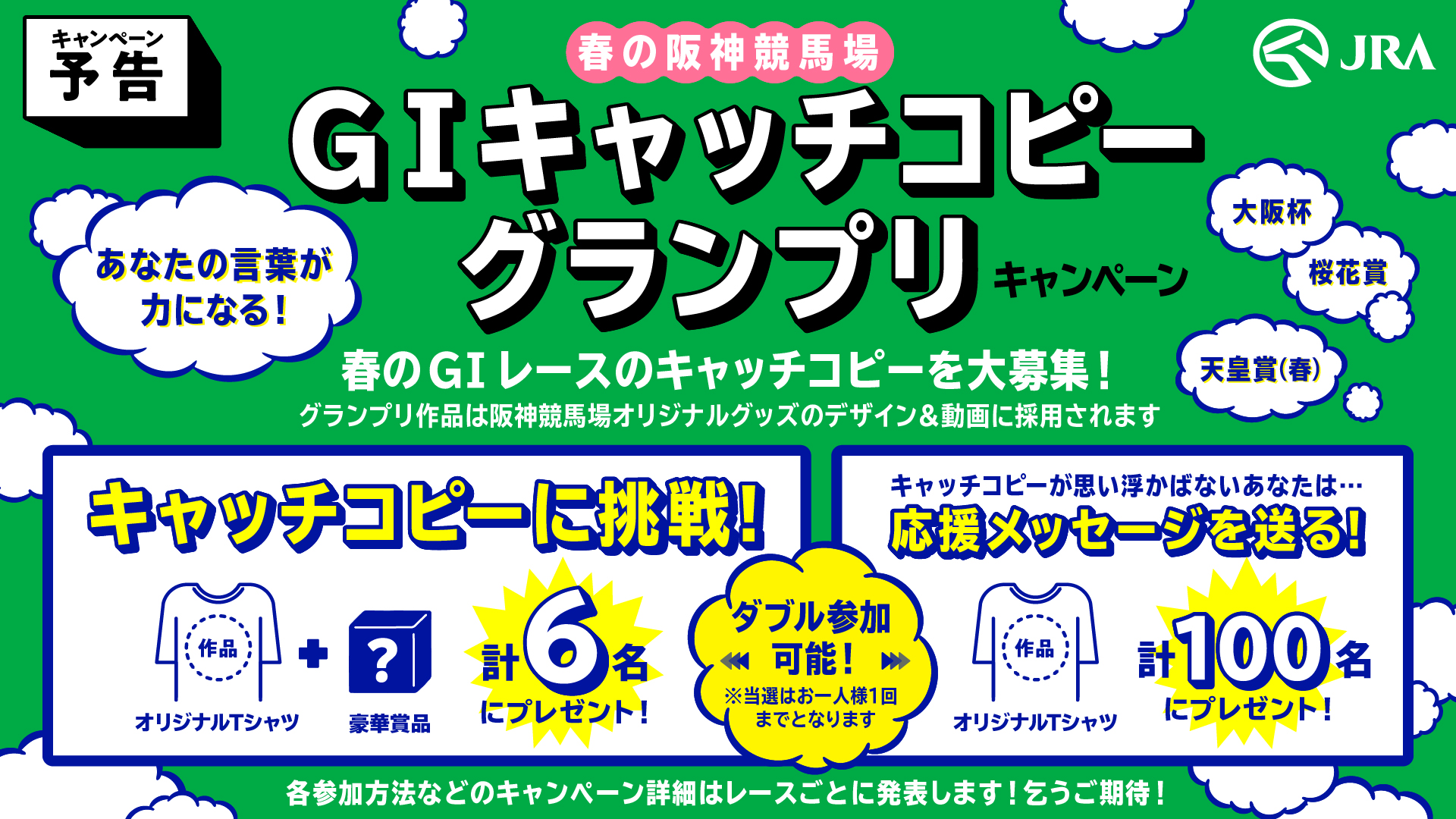 阪神競馬場キャンペーン 公式on X: " 予告\あなたの言葉が力になる!春の阪神競馬場 GⅠキャッチコピーグランプリ!✨阪神競馬場ではこの春、3つのGIレースを開催にあたって 「大阪杯」「桜花賞」「天皇賞 春 」のキャッチコピーや応援メッセージを大募集。