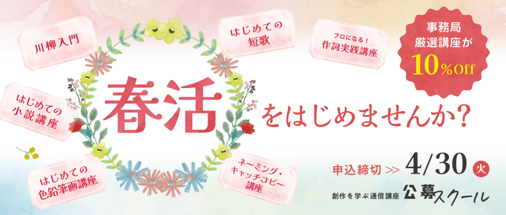 春活キャンペーン実施中! 事務局厳選講座が、10%Off!! 4月30日までニュース公募スクール。