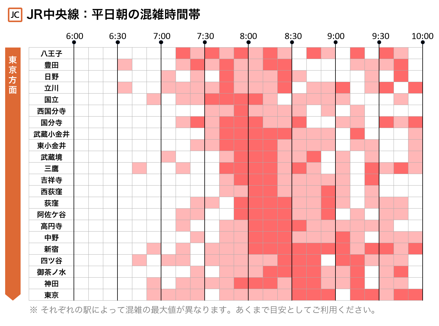 一目でわかる主要路線での平日朝の混雑時間帯 2023年版- Yahoo!路線情報公式ブログ。