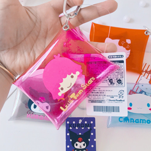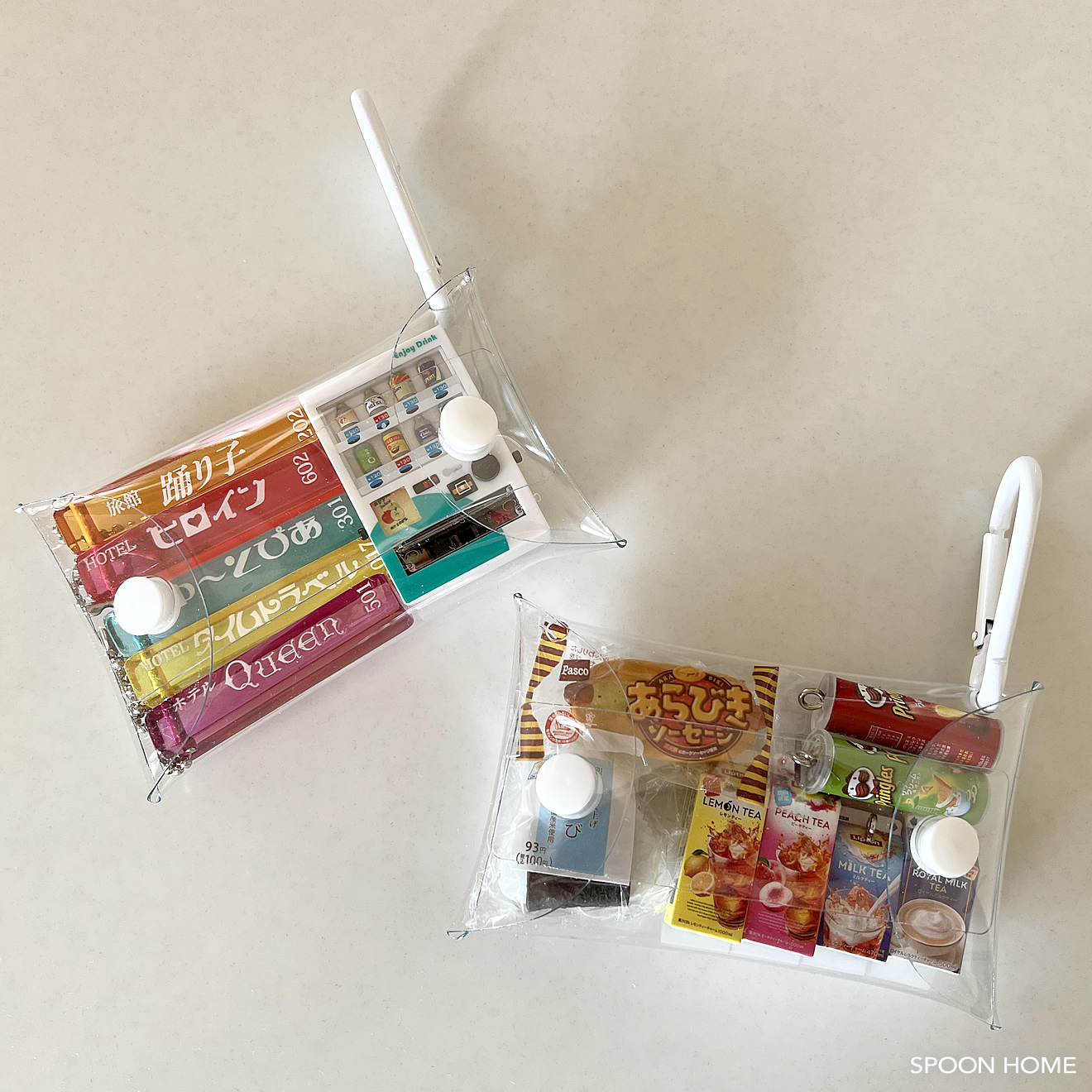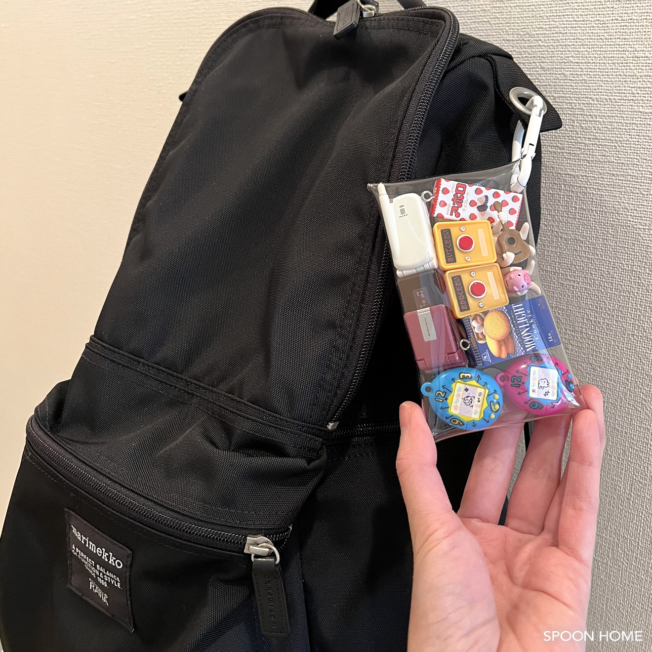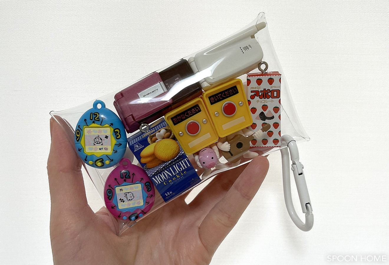 透明な小物ケース「カラビナ付きクリアポーチ」が便利。ガチャガチャのコレクション入れに。