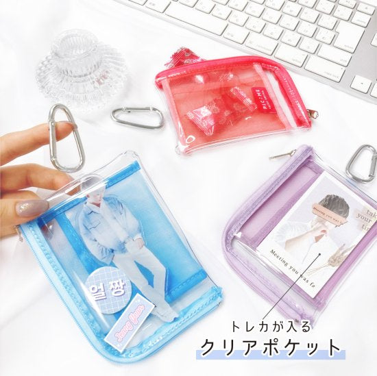 カラビナ付き クリアポーチ トレカケース チェキケース 推し活グッズ レッド ピンク イエロー グリーン ブルー パープル ブラック ホワイ —Etamo。