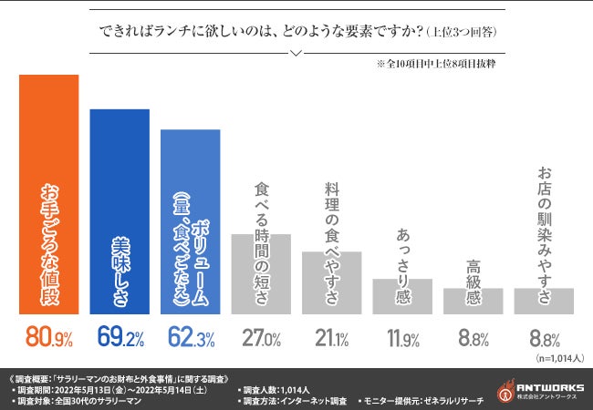 値上げが相次ぐ現在 30代サラリーマンのランチ事情とは? 外食に求める3要素は「安い」「うまい」「ボリューム満点」株式会社アントワークスのプレスリリース。