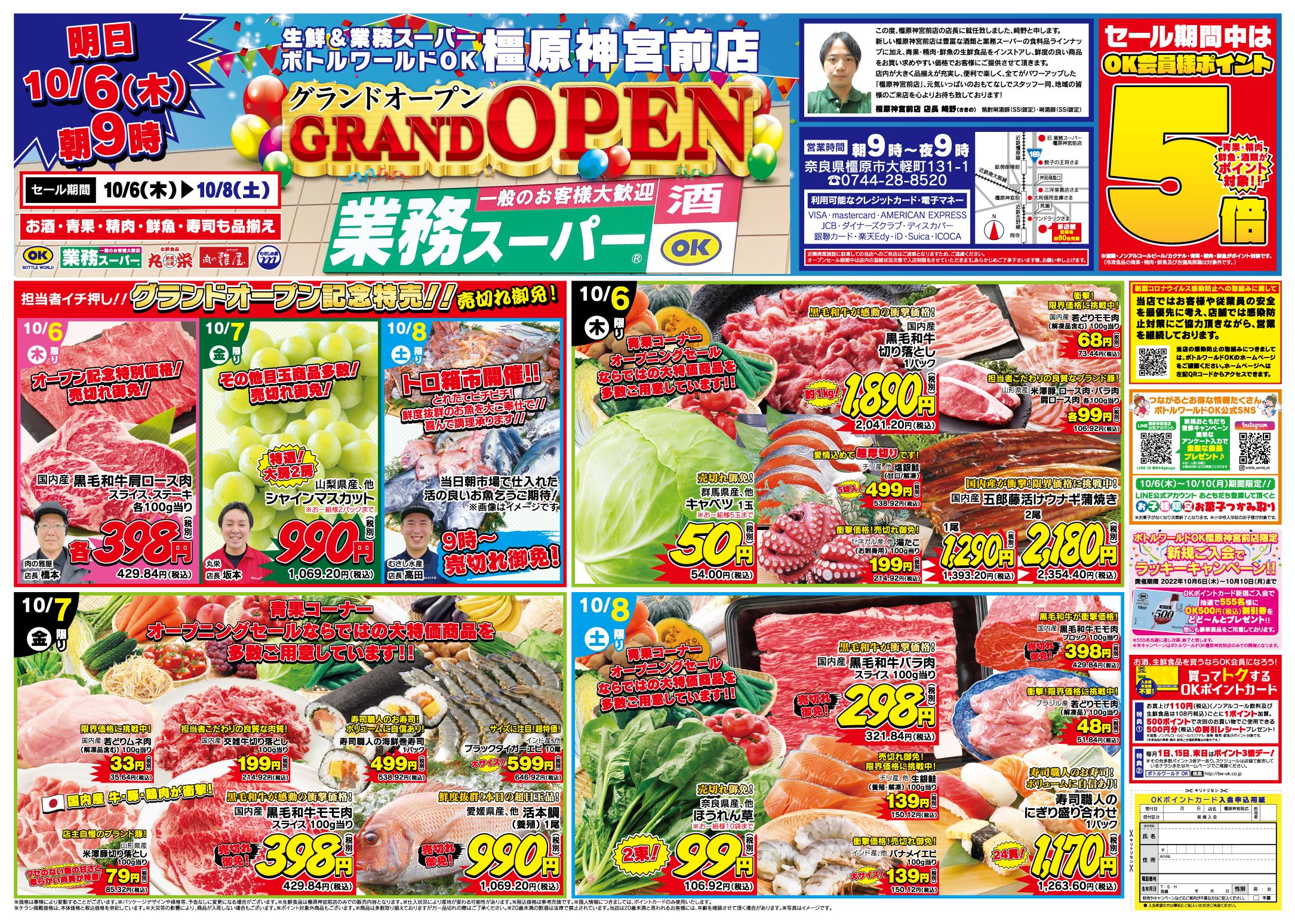 オープンチラシ追記 2022年10月6日オープン。現店舗は9月16日閉店→業務スーパー橿原神宮前店 生鮮&業務スーパーボトルワールドOK,奈良県橿原市 2022年10月上旬移転オープン,青果テナント丸栄出店,– 食彩品館.jp。