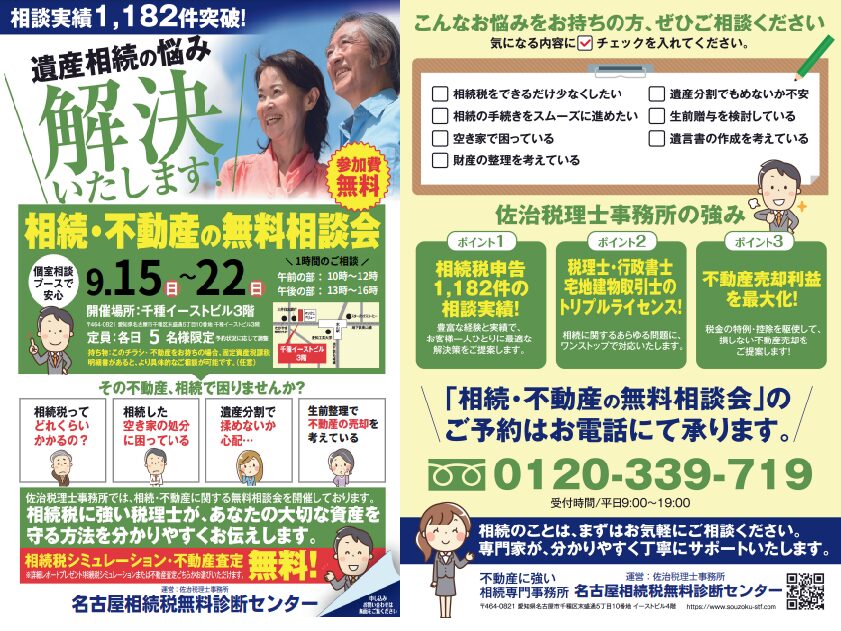 相続・不動産の悩みを解決!2024年秋の無料相談会のお知らせ名古屋相続税無料診断センター名古屋相続税無料診断センタ。