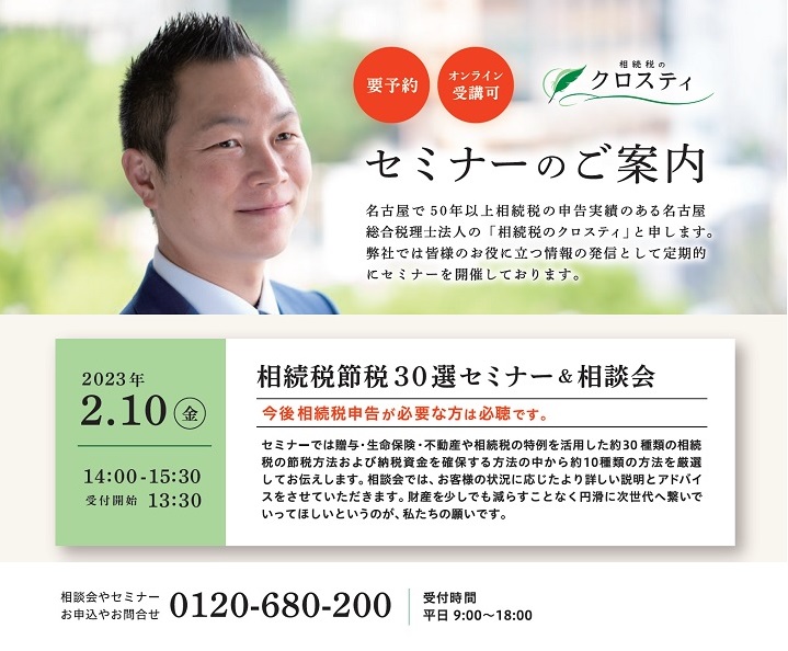 2月開催セミナー ~相続税節税対策~相続税節税30選セミナー&相談会2023.2.10開催相続税 のクロスティ 名古屋総合税理士法人 名古屋市の相続税専門税理士。