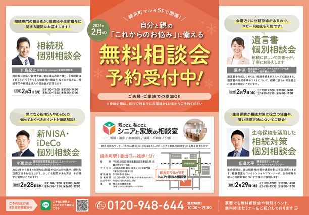 2024年2月無料セミナーラインナップ 相続税対策や新NISA・iDeCo、遺言書作成、生命保険を使った相続対策など、無料相談会も充実!シニアと家族の相談室。