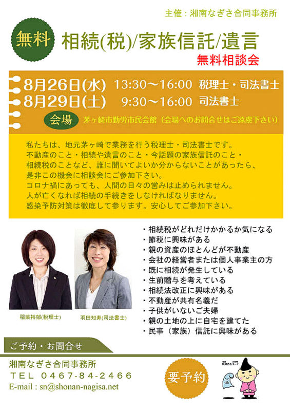 8月の相続 税家族信託 遺言無料相談会のお知らせ - とことこ湘南。