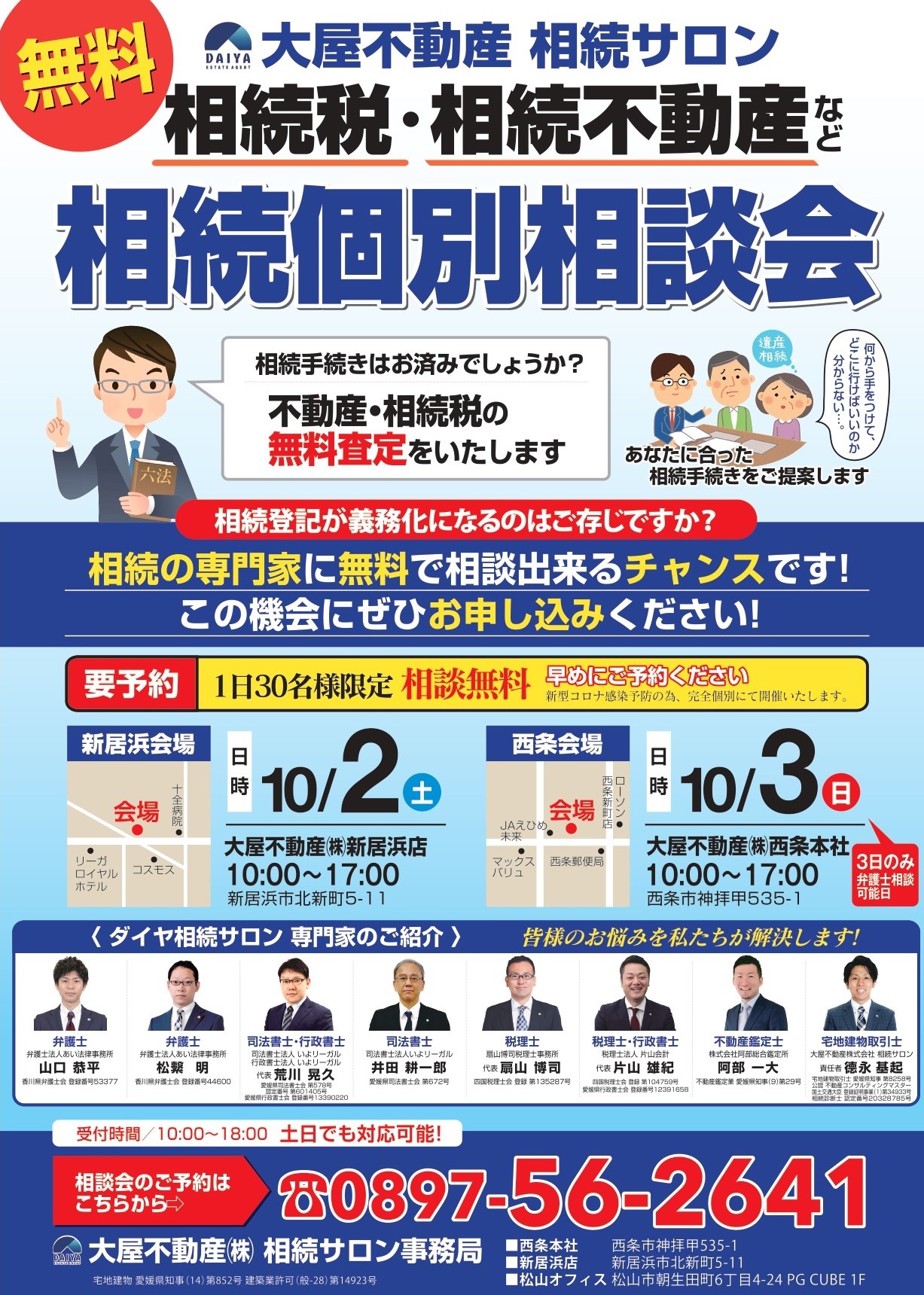 ☆10月の相続無料相談会のお知らせです☆大屋不動産株式会社 -ダイヤホーム愛媛県西条市・新居浜市・松山市の新築・注文住宅・リフォーム・不動産・賃貸・分譲地。