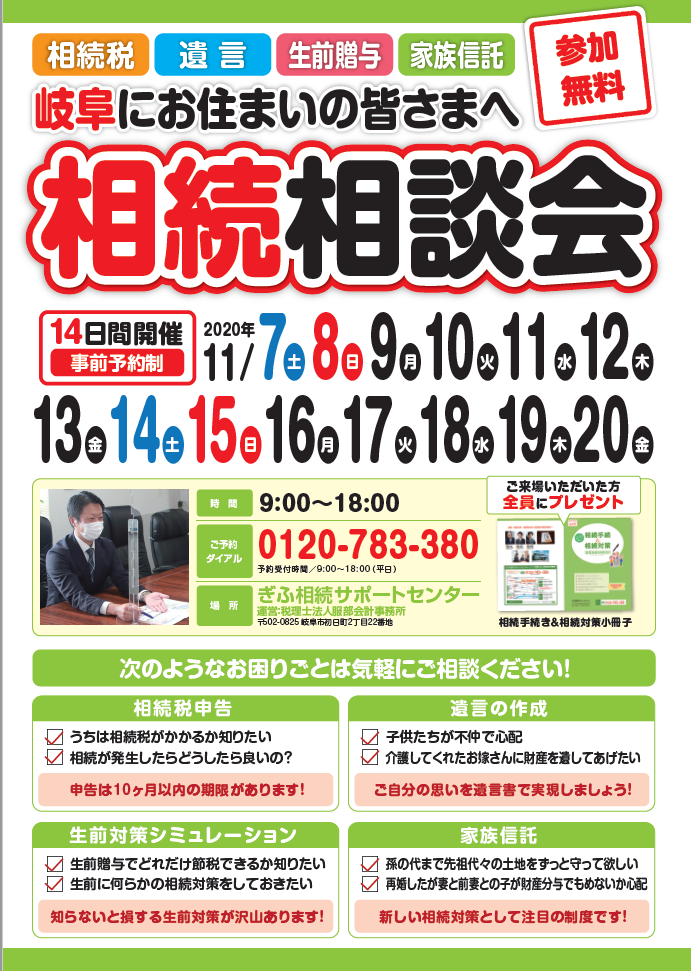 10月4日~16日 秋の相続税無料相談会を開催いたします 相続税専門の税理士「小牧相続税申告相談プラザ」 小牧市・春日井市周辺。