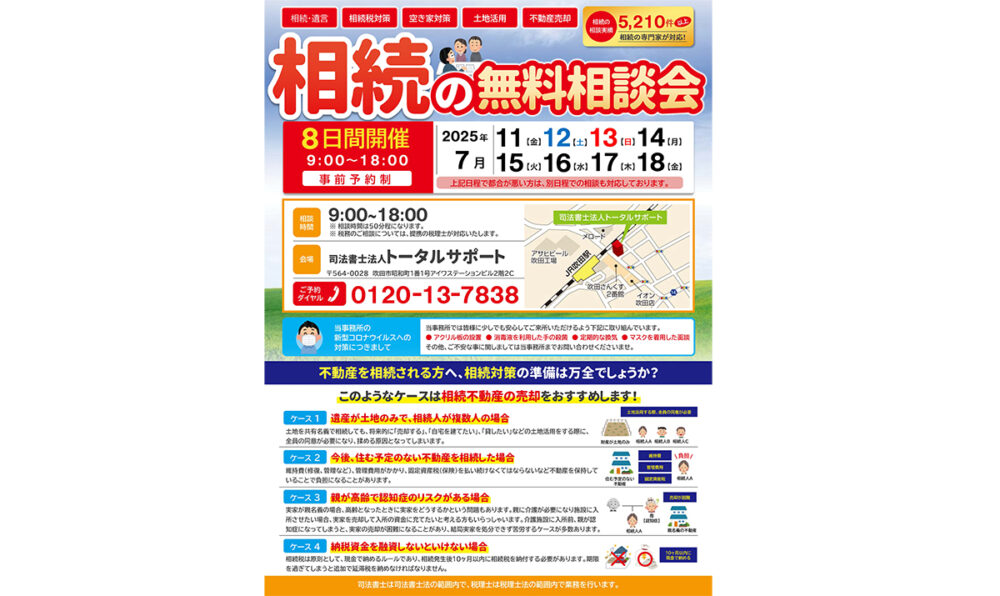 大阪 相続相談会チラシ令和7年8月度 裏相続・遺言手続トータルサポート。