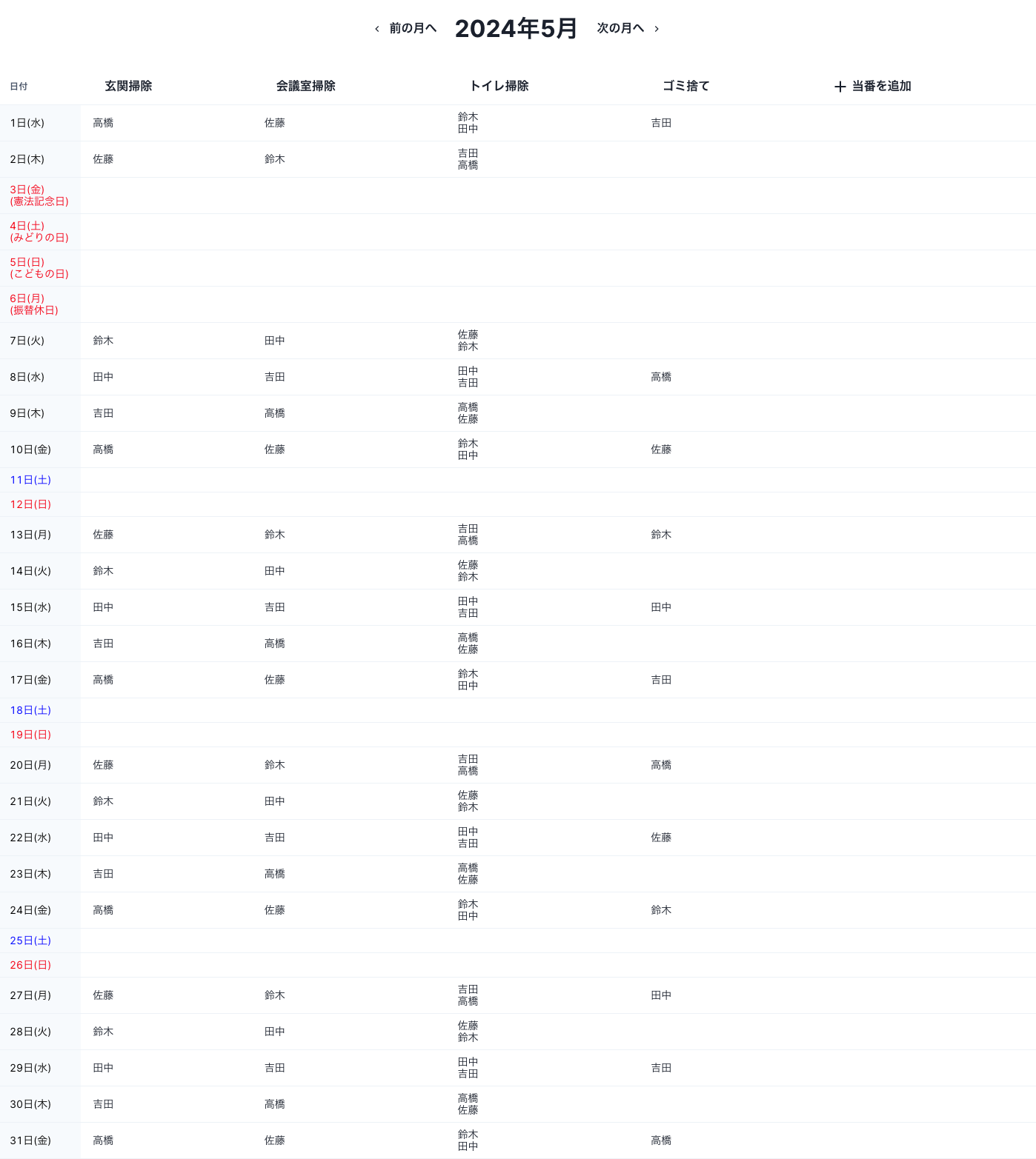 マンション、アパート、会社、学校、寮など共有施設で使用しやすい「掃除当番表 1年分 」のテンプレート - シムム。