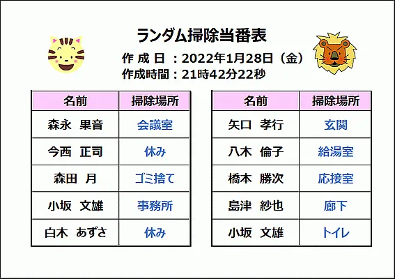 ランダム 掃除当番表Excel関数を使用した無料テンプレート。