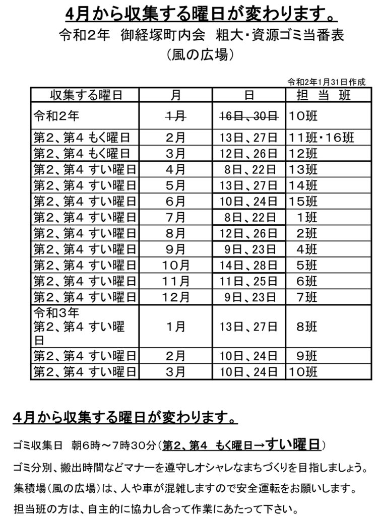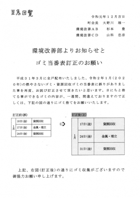 ゴミ当番表訂正のお願い - 田上新町たがみしんまちブログ。