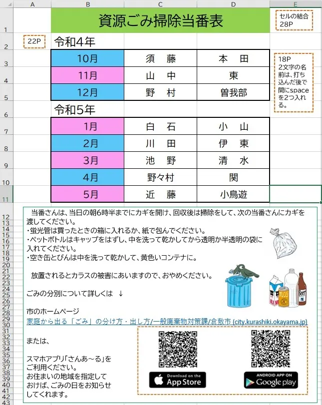 作り方が簡単な町内会のゴミ当番表 分別チェック・捨て場の清掃 Excel・Wordで手作りの無料テンプレートをダウンロード。
