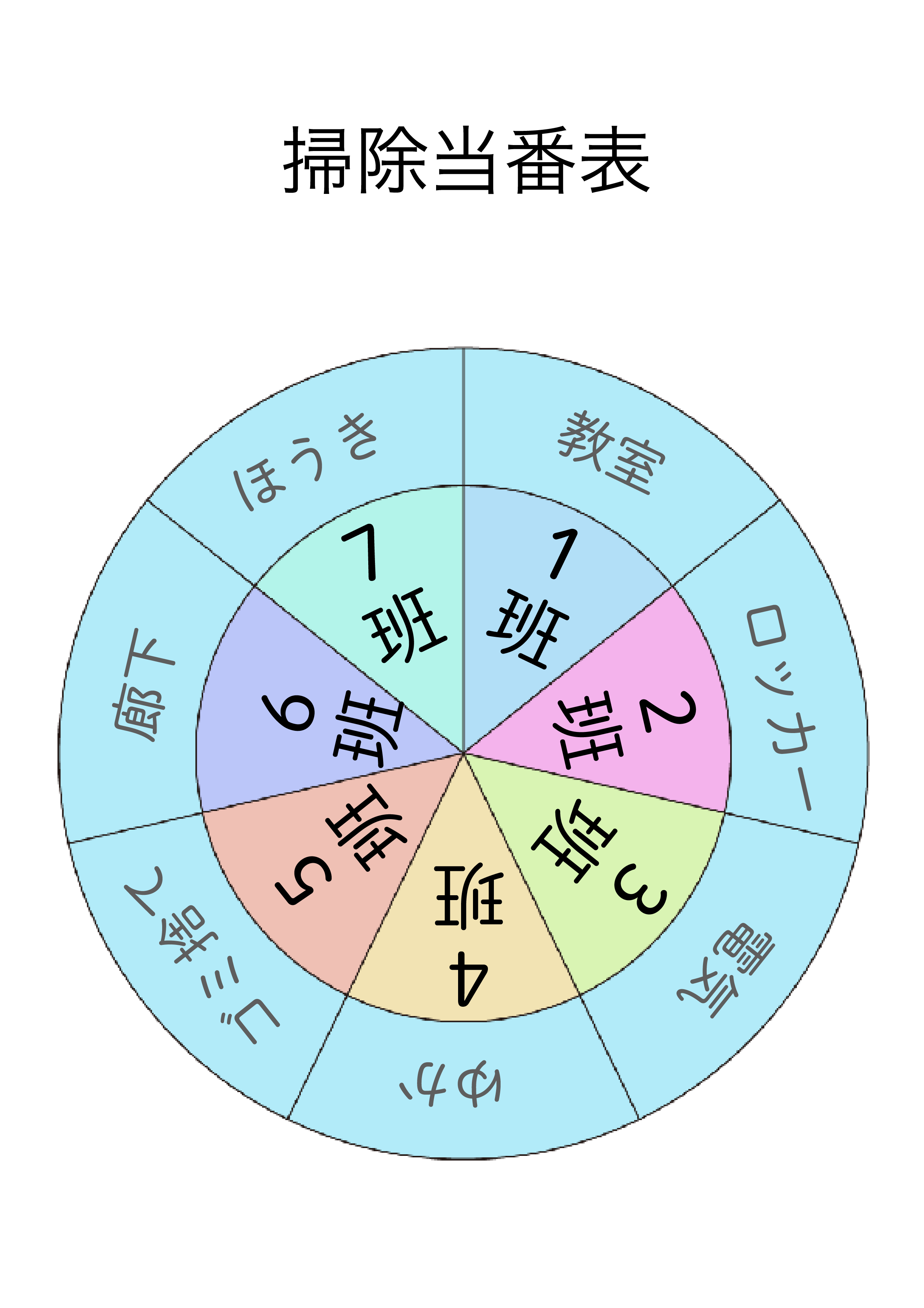 丸型の掃除当番表テンプレート7班分エクセル・ナンバーズ無料テンプレート Mac・Windows 『ひな形ジャーナル』。
