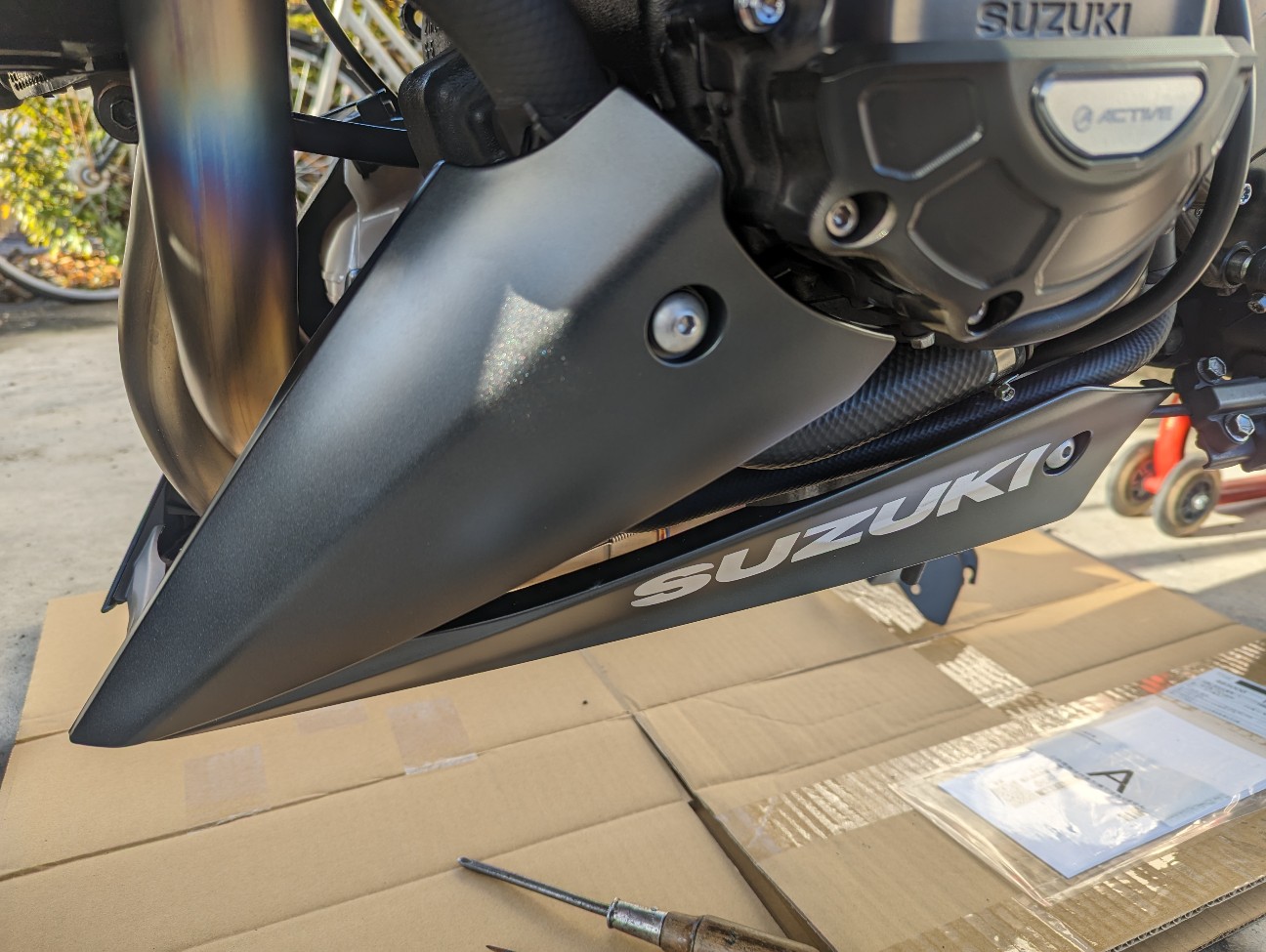 GSX-S1000で使用 新型カタナ 純正アンダーカウル カタナにGSX-S1000 20年 の純正アンダーカウルを流用 純正。