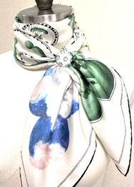 お帽子代わりに頭にスカーフを巻くだけで一気に秋モード。, 雰囲気中心から少しずらした位置で留めると、バランス良く仕上がります。,スカーフサイズ90×90cm ,フクロウ 8,800円 税込 ,リライアンス,ストールクリップスカーフアレンジ,銀座三越新宿伊勢丹横浜高島屋うめだ阪急。