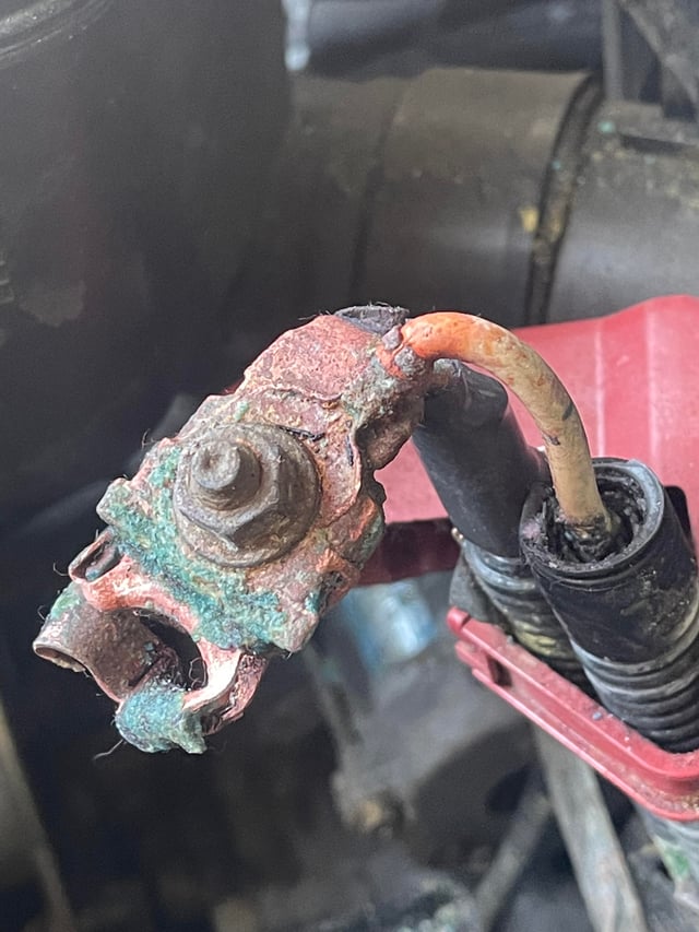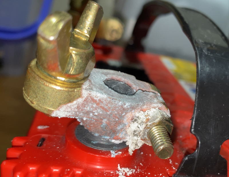バッテリーのプラス端子に付着している白い腐食性の粉は何で、どうすればいいの? コメントに詳しく: r MechanicAdvice。