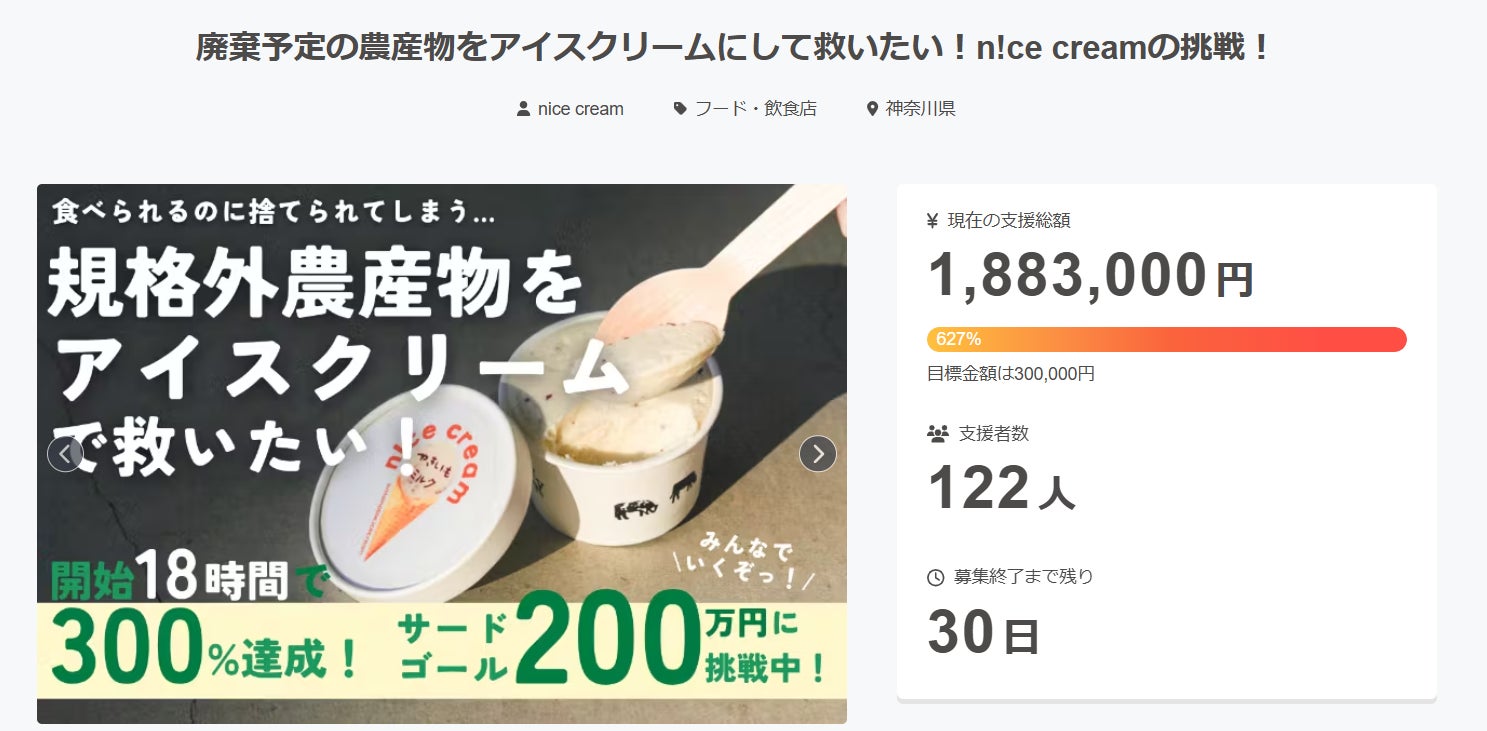 開始1日で300%達成! 廃棄農産物を救うアイスクリームブランド「n!ce cream」がクラファンで最終ゴール1,000%へ向け挑戦中!n!ce creamのプレスリリース。