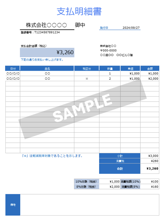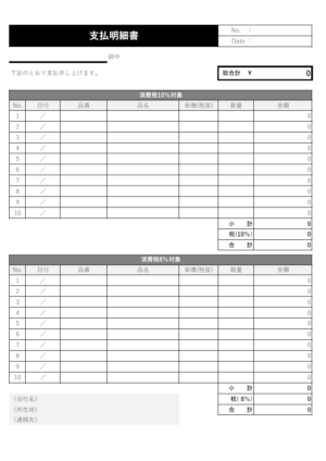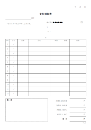 税率別の支払明細書のテンプレート・Excel無料のビジネス書式テンプレート。