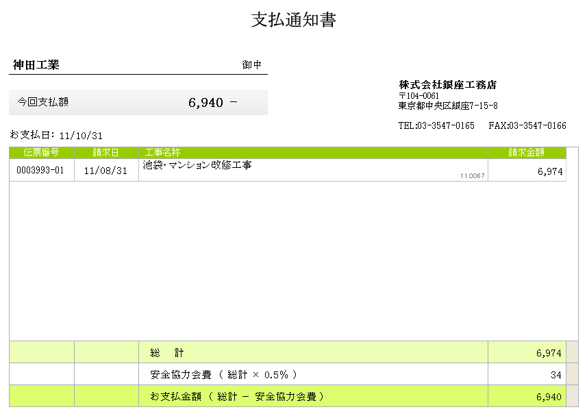 支払通知書 支払明細かんたん工事台帳ソフト「トリ決め!」。