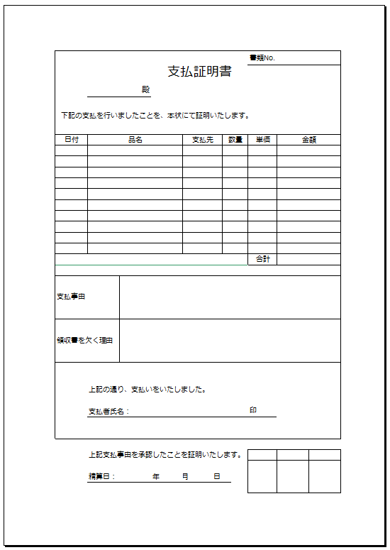 支払証明書のテンプレート_全業種対応_シンプル A4 エクセル・ナンバーズ無料テンプレート Mac・Windows 『ひな形ジャーナル』。