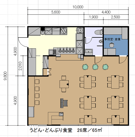 うどん・どんぶり店-飲食店舗の図面・3Dサンプル-店舗デザイン・レイアウトソフト「3D飲食店プランナー」。