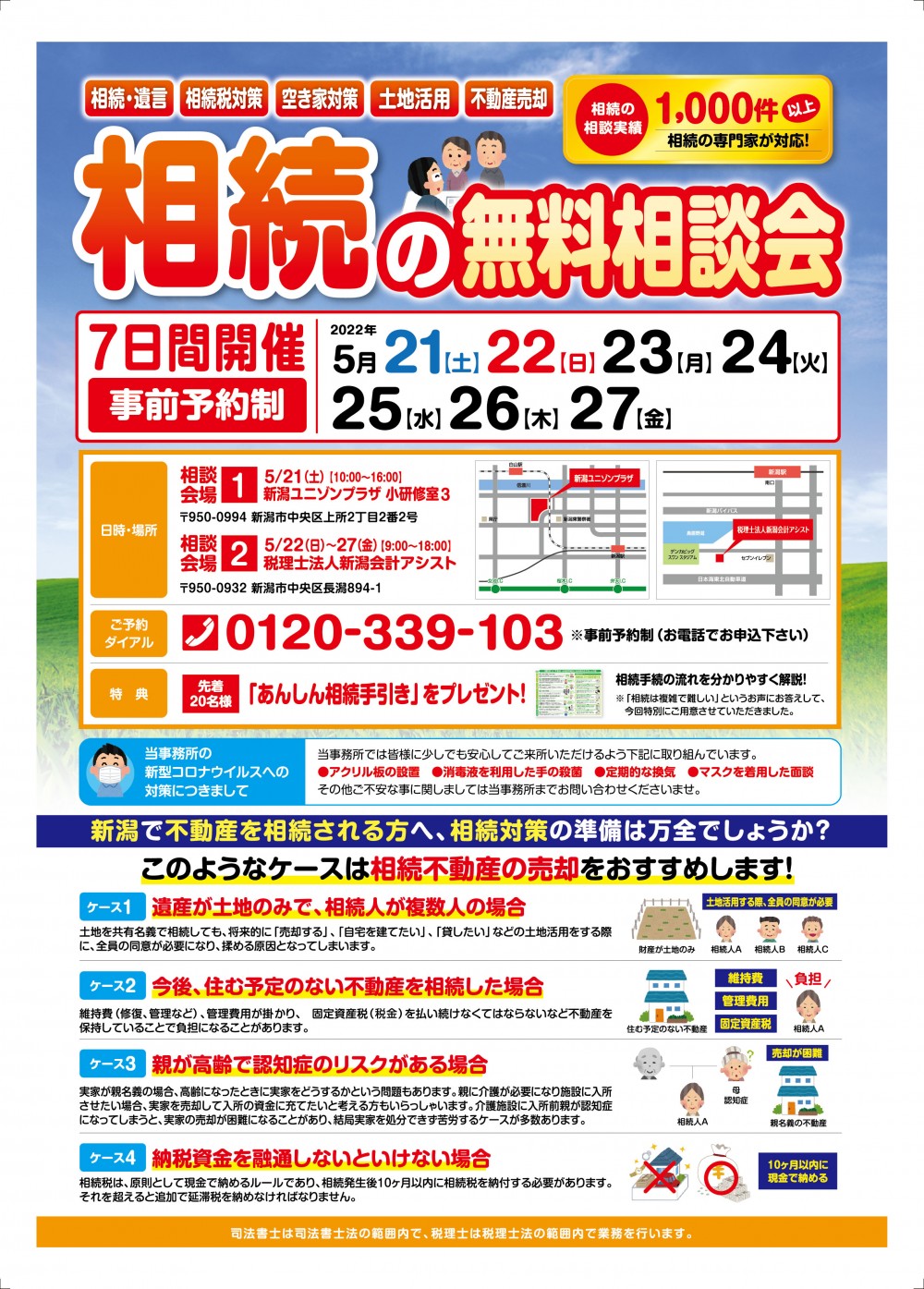 相続の専門家による無料相続相談会を開催! 5月21日 土 ~27日 金- 新潟相続相談室。
