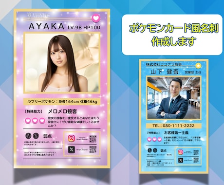 insta.urakata名刺ご依頼実例「インパクトのある面白い名刺」 というご依頼でした😂✨ 可愛い名刺はもちろん、 印象に残る面白いデザインもお任せ下さい♡ デザインと別途料金で 印刷も50枚〜承っております✨ @ao.yurie 様 ありがとうございました。
